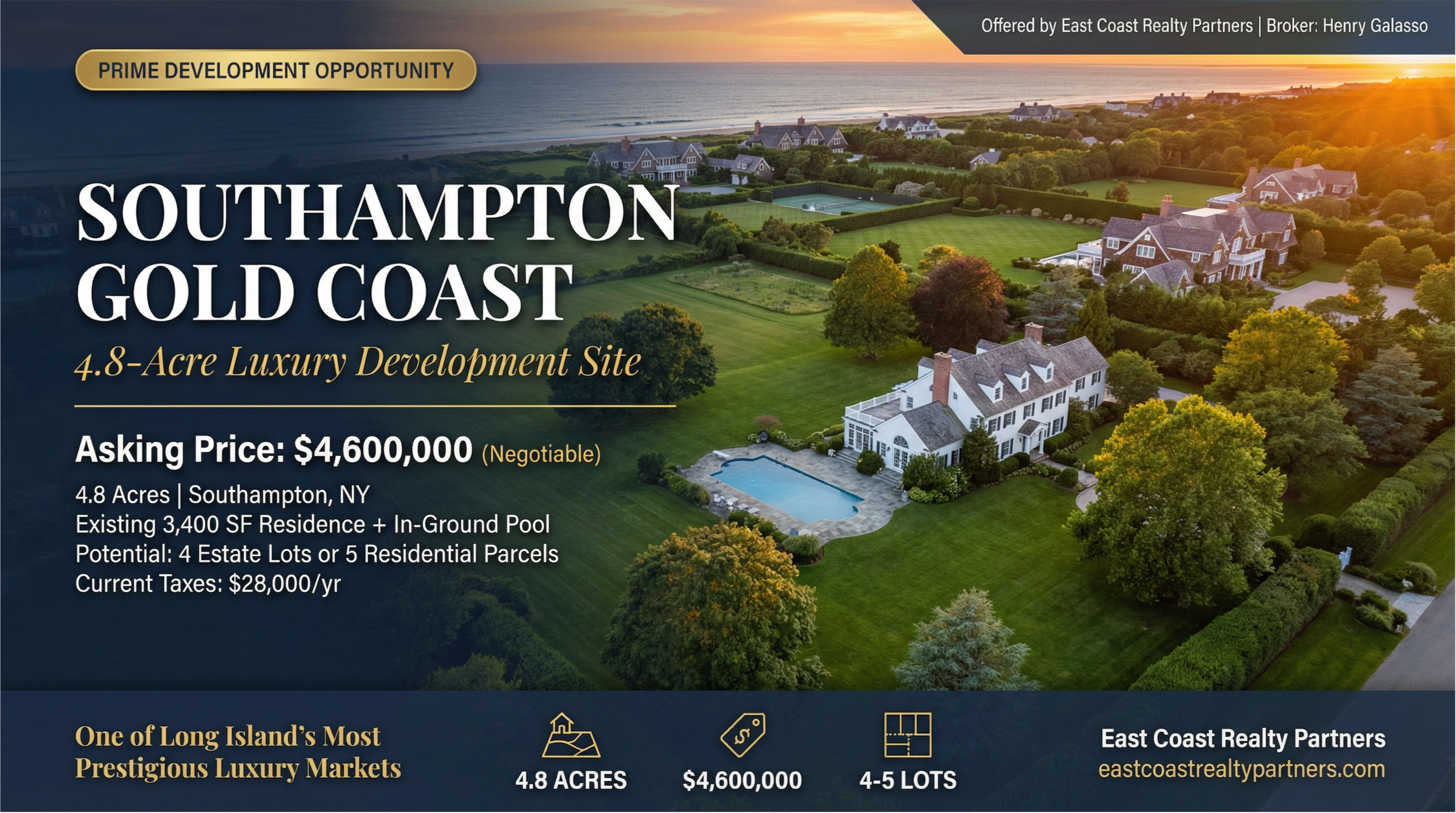A rare opportunity to acquire 4.8 acres of prime residential land in Southampton, located in one of Long Island’s most prestigious luxury markets. Large parcels of this size are increasingly scarce, making this an outstanding opportunity for developers, builders, or investors looking to create a luxury estate subdivision.